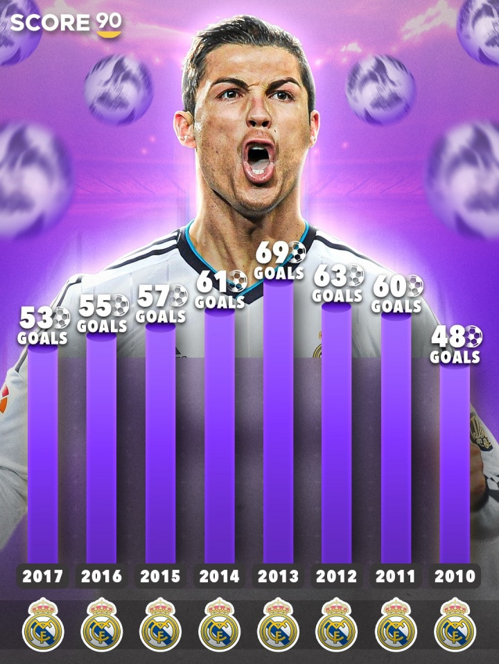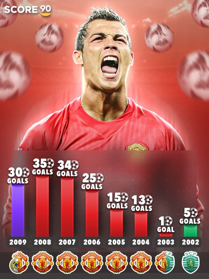 2009年(曼联/皇马):30球 2008年(曼联):35球 2007年(曼联):34球 2006年(曼联):25球 2005年(曼联):15球 2004年(曼联):13球 2003年(葡体/曼联):1球 2002年(葡体):5球 当今C罗做事生存的进球数依然来到了957球,若是他思在来岁终了生存1000球的豪举,就需要在2026年打入43球。 体育录像/图片