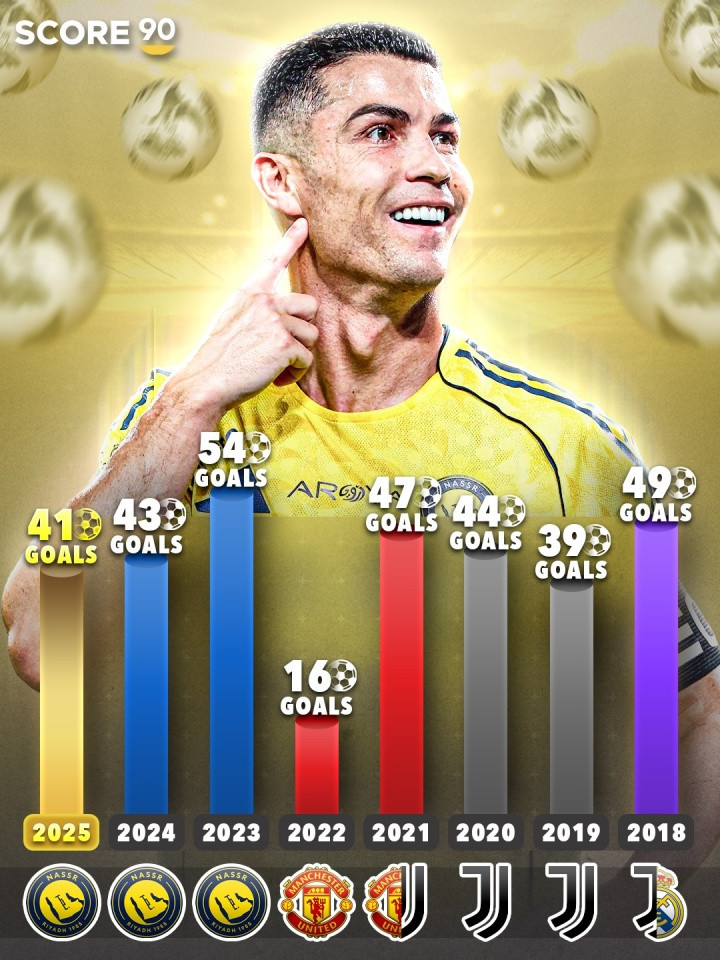直播吧12月31日讯凌晨沙特联利雅得得胜2-2战平达曼融合,C罗打入一球,他2025年的进球数也定格在了41球。 外媒Score90统计了C罗做事生存每一年的进球数↓ 2025年(利雅得得胜):41球 2024年(利雅得得胜):43球 2023年(利雅得得胜):54球 2022年(曼联):16球 2021年(尤文/曼联):47球 2020年(尤文):44球 2019年(尤文):39球 2018年(皇马/尤文):49球 2017年(皇马):53球 2016年(皇马):55球 2015年(皇马):57球 2014年(皇马):61球 2013年(皇马):69球 2012年(皇马):63球 2011年(皇马):60球 2010年(皇马):48球