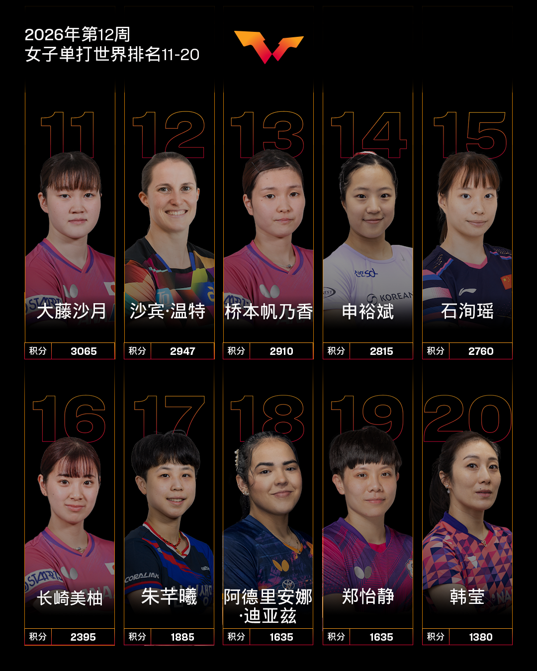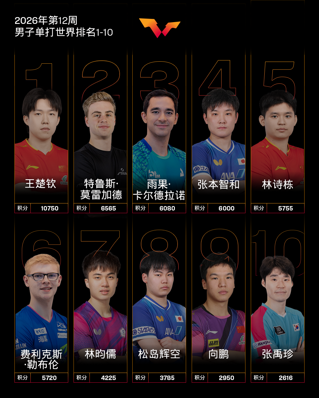 3月16日体育录像/图片,海外乒联公布了2026年第12周到国排名。 男单前10位中,中国队球员王楚钦位列第1,林诗栋位列第5,向鹏位列第9。 在WTT重庆冠军赛上获取男单亚军的温瑞博排名高涨10个排行位列第17,刷新个东说念主行状生活排名新高;打入4强的日本球员张本智和排名高涨1个排行位列第4;打入8强的巴西球员雨果排名高涨1个排行位列第3。 其他排名前50的中国队球员中,梁靖崑排名第13,周启豪排名第22,陈垣宇排名第23,陈俊菘排名第37。