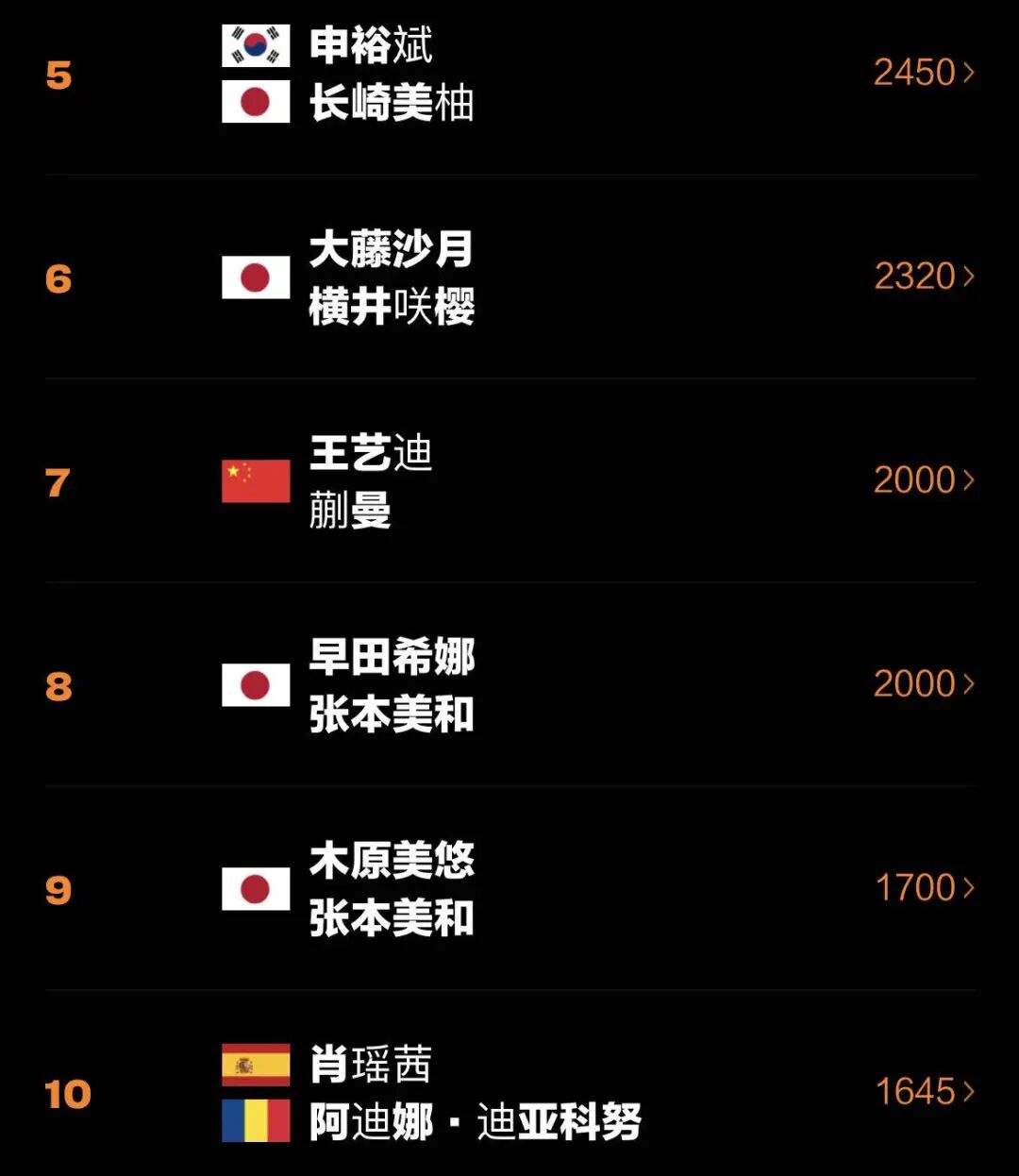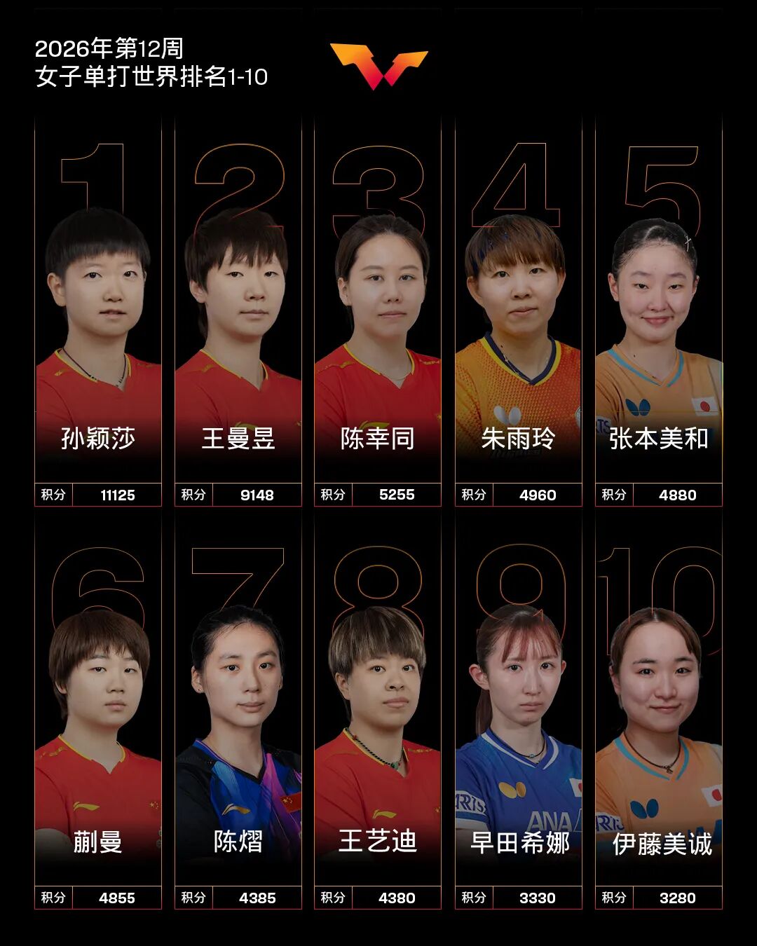 女单前10位中,中国队球员孙颖莎、王曼昱、陈幸同位列前3,蒯曼位列第6,陈熠位列第7,王艺迪位列第。 WTT重庆冠军赛女单冠军、日本球员张本好意思和排名上3个排行位列第5;打入4强的日本球员大藤沙月排名上2个排行位列第11。 其他排名前50的中国队球员中,石洵瑶排名第15,何卓佳排名第38,覃予萱排名第39。