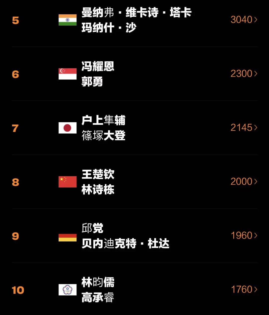 双打方面,排名靠前的组合莫得变化,法国的勒布伦昆仲、韩国组合金娜英/柳韩娜和林钟勋/申裕斌分列男双、女双和混双排名榜榜首。 男双